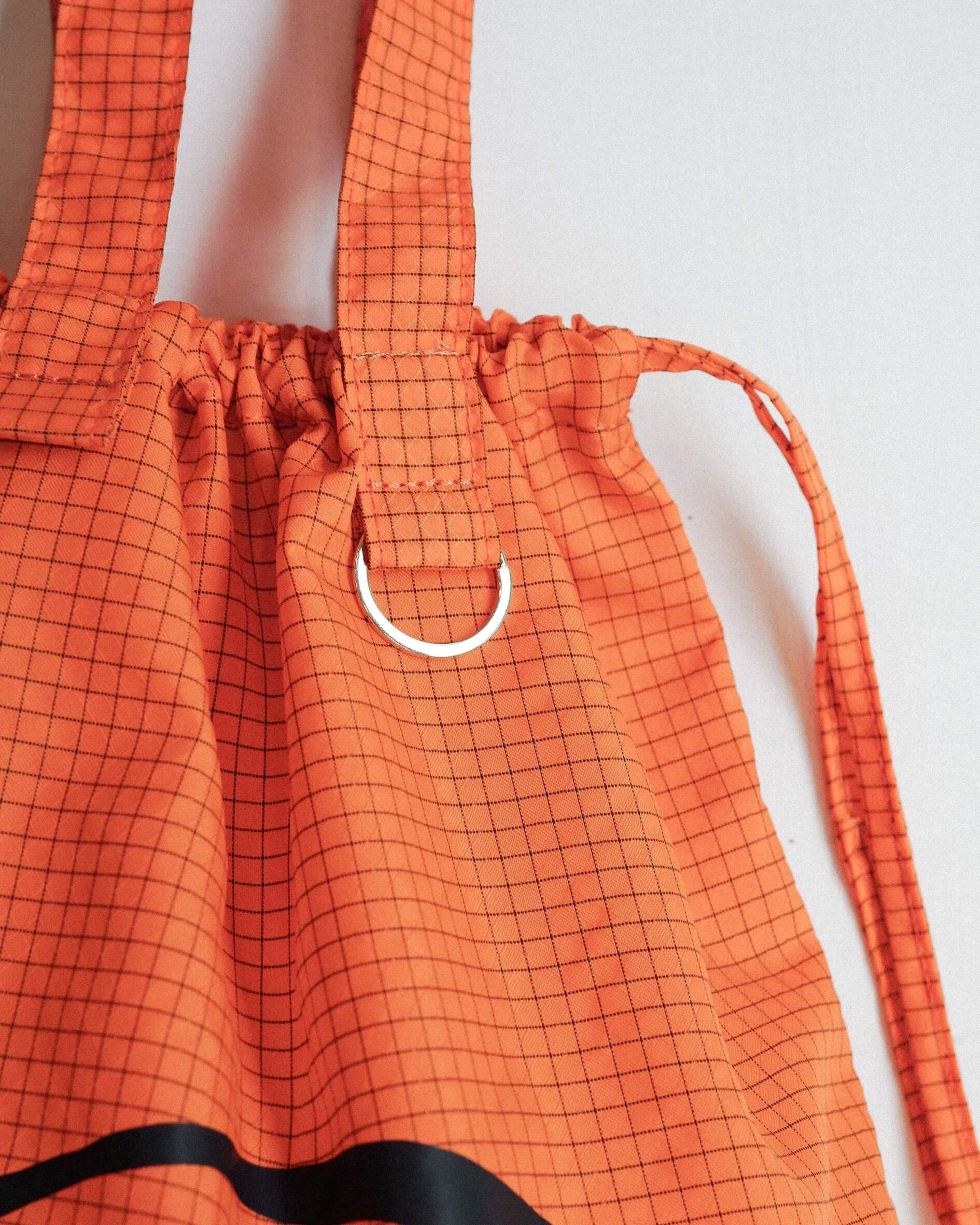撥水ナイロン素材を使用しアウトドアや水遊びシーンにもちょうど良い。内側には収納できるポケット付き。鍵やチャーム、サングラスを引っ掛けられるキーリングつき。