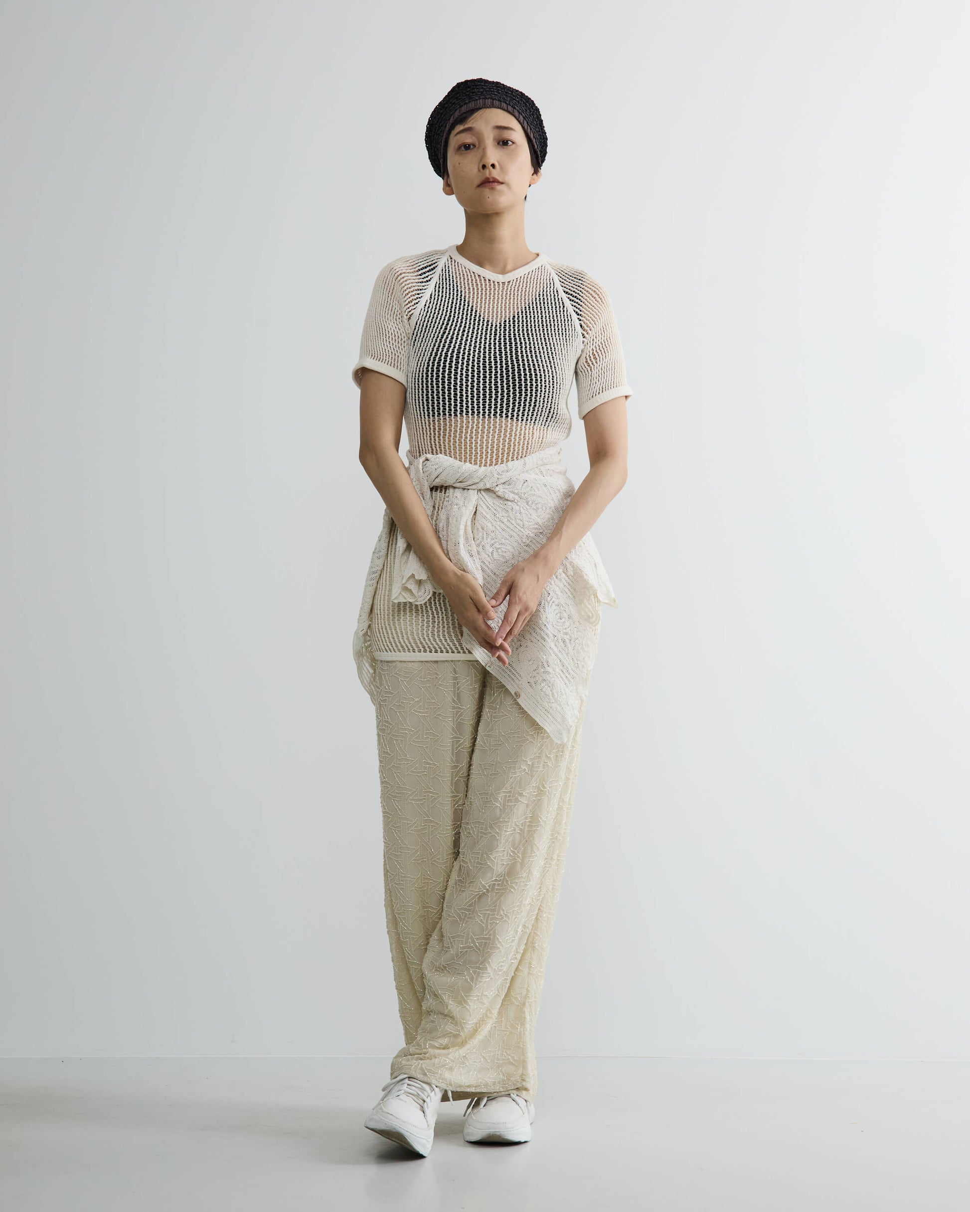 職人による手編み仕上げで、透け感がある変則細編みが繊細な表情を生み出します。