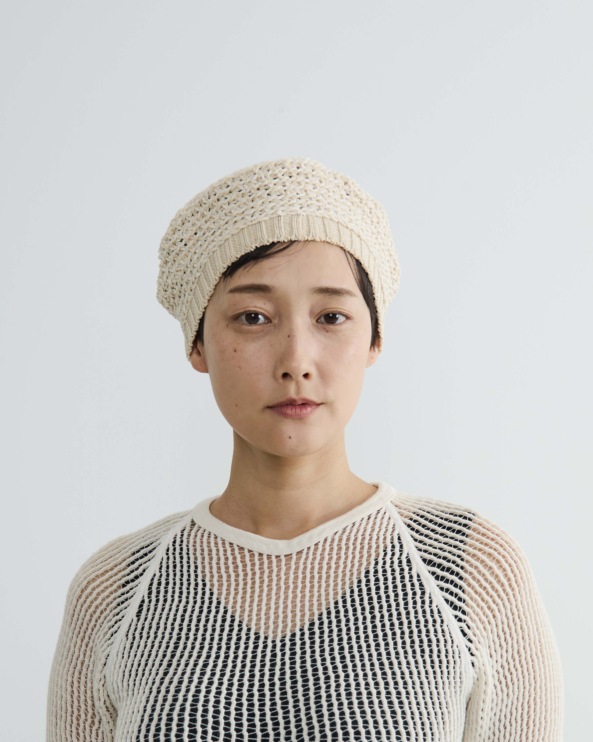 ミニマルなデザインと弛みのないフィット感が魅力の手編みのニットベレー。